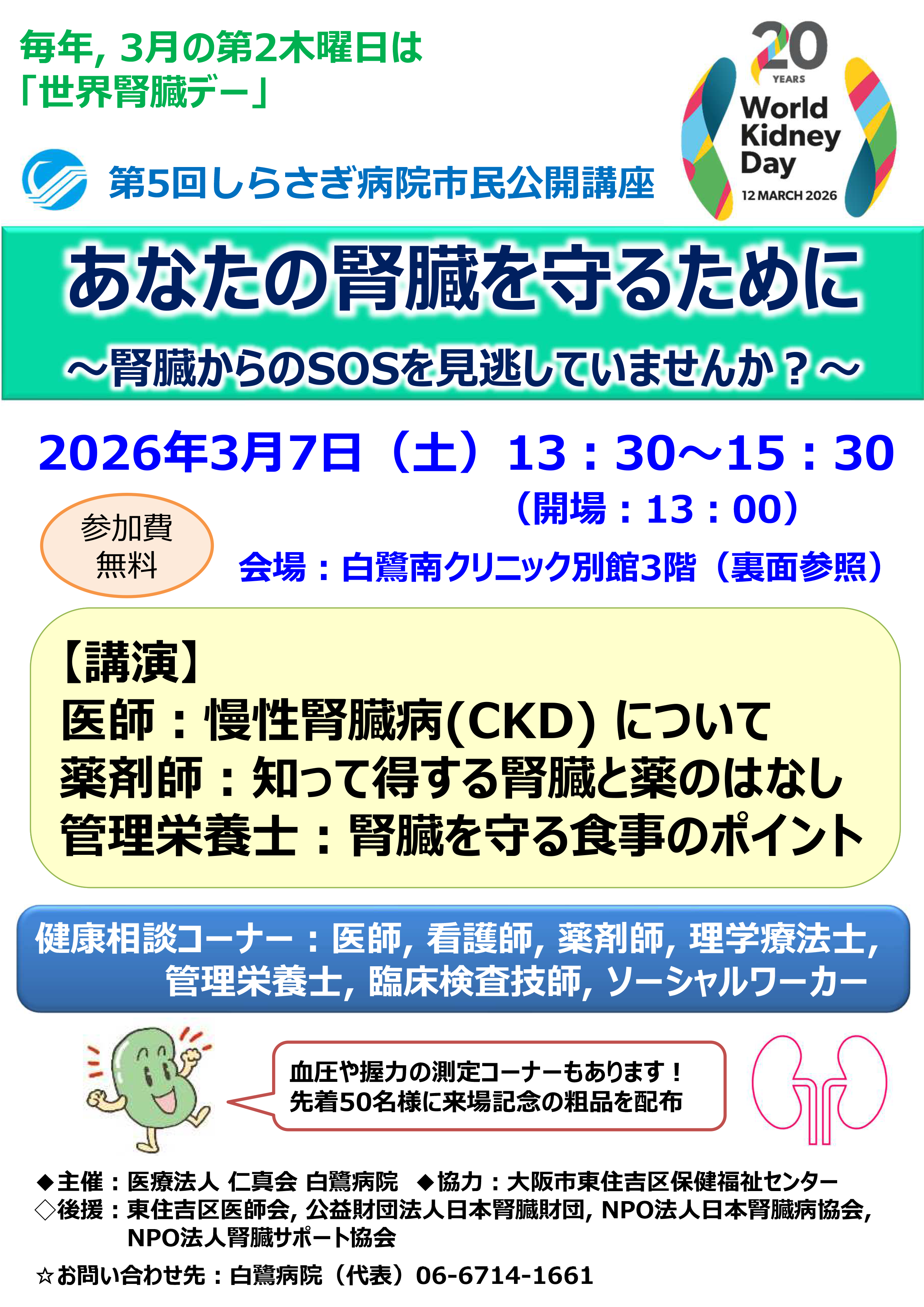 東住吉区医師会、公益財団法⼈日本腎臓財団、NPO法⼈日本腎臓病協会、NPO法⼈腎臓サポート協会